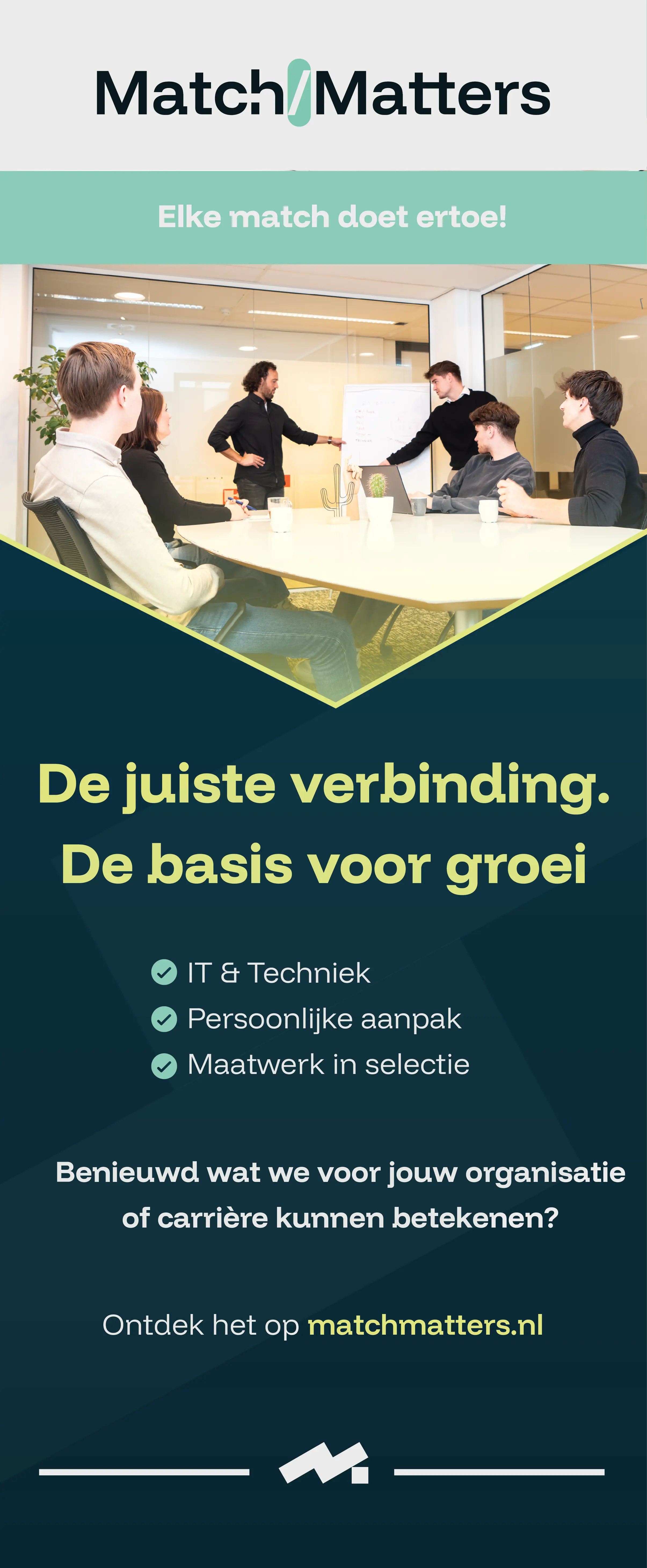 MatchMatters brengt talent en bedrijven samen in een tijd waarin de behoeften centraal staan. Geen snelle oplossingen, maar de juiste match voor de lange termijn. Met de ervaring die we in tien jaar hebben opgebouwd weten we met onze persoonlijke aanpak wat er écht toe doet. Van IT tot Onderwijs, van Techniek tot Zorg, en van Sales tot Finance: wij kennen de weg in vrijwel elke branche. Ons team van ervaren consultants begeleidt je in elke stap van het proces.